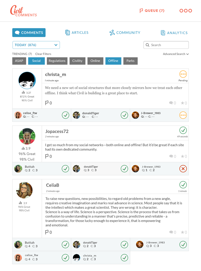 As comments are submitted, reviewed, and either published or rejected, you can watch the data come in live in the Civil Comments admin tools. Reviews from other commenters are updated as they come in, with the Quality and Civility score listed, as well as the publication verdicts per-commenter and combined final decision.